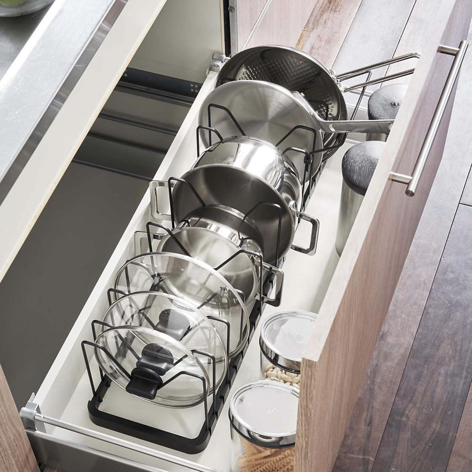 Another great product for space-saving and combating kitchen clutter is this Pot Lid & Frying Pan Organizer from Crate & Barrel. It keeps your pots, pans, and lids organized and easily accessible while freeing up valuable cabinet and counter space. The adjustable design allows you to customize it to your specific needs, making it perfect for any kitchen size. The sleek and stylish design complements any kitchen decor, adding a modern touch to your space. Overall, this product is a must-have for anyone who values a clean and organized kitchen.