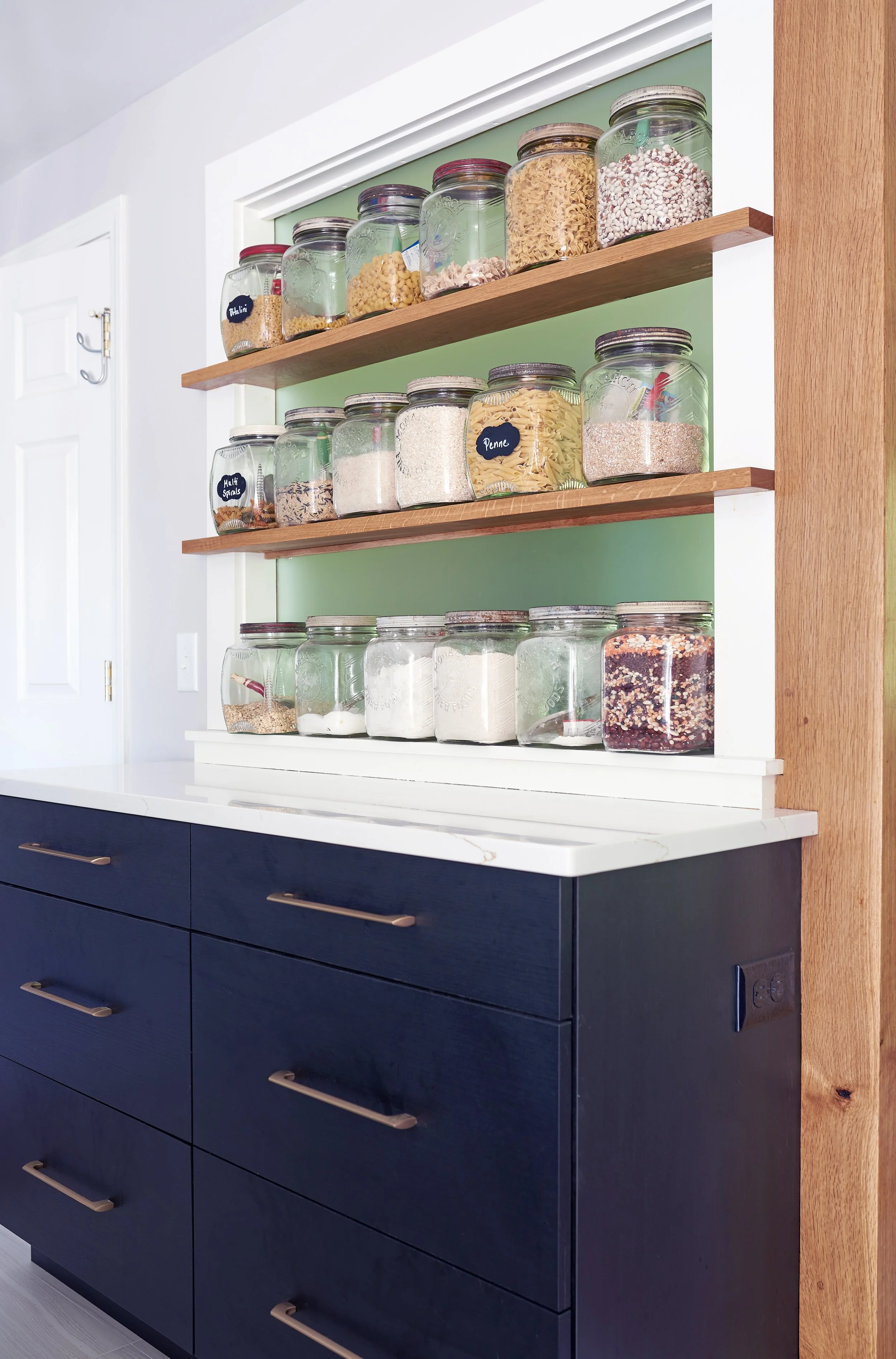 If your kitchen has a few open shelving spaces, this can be a fun area to decorate and get more creative with displaying items that may normally stay in the pantry in their original packaging. A great way to use these shelves is to store items using larger mason jars or French canning jars, to showcase different dried goods. This can add more character to the kitchen, and even add a touch of color. When organizing dinnerware, keep plates all on one shelf and display the cups grouped up by their color or shape.
