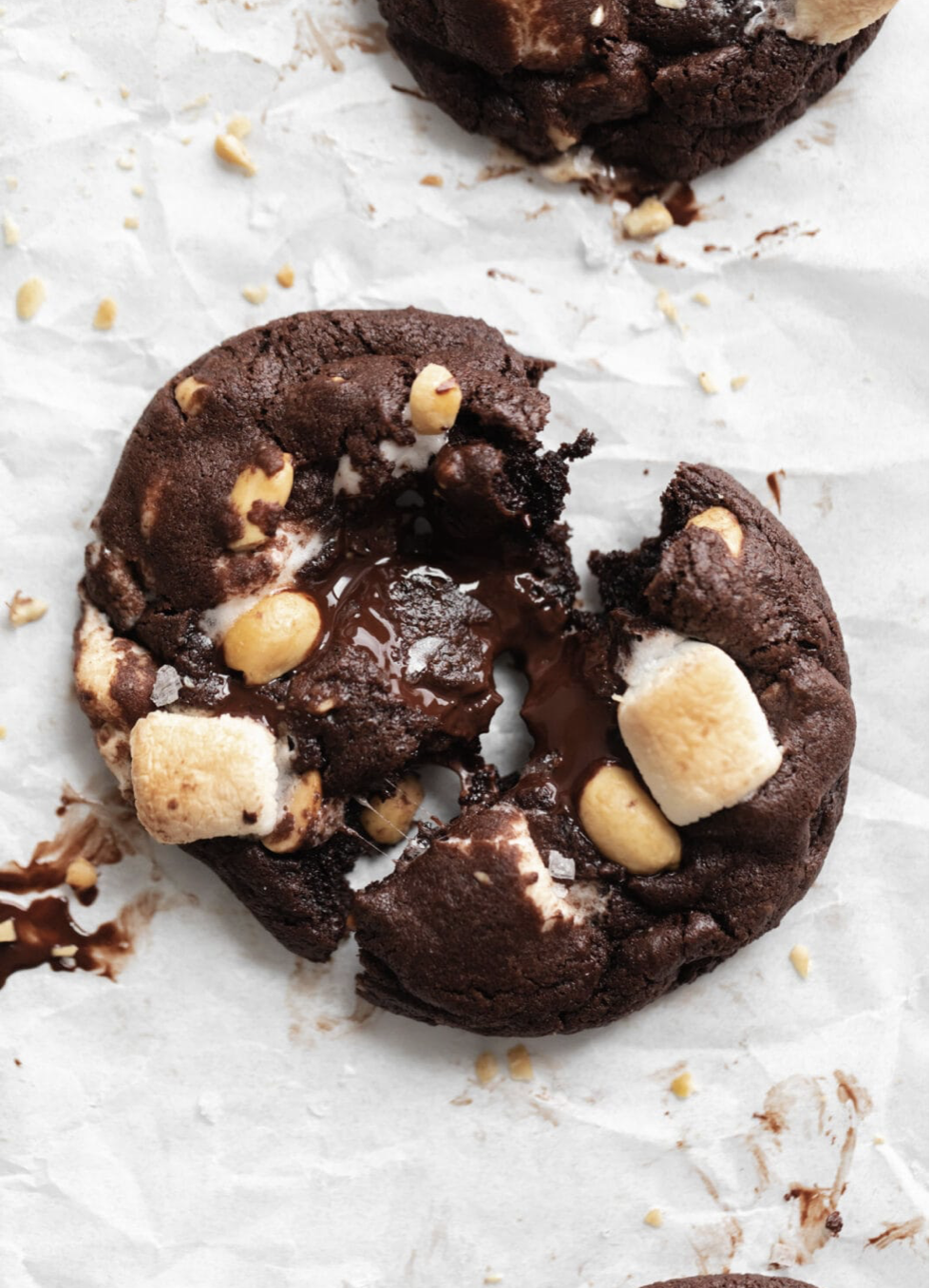 Use a 2-ounce cookie scoop to drop the cookie dough onto your prepared cookie sheet 2 inches apart. Press a few extra marshmallows on top of each cookie.