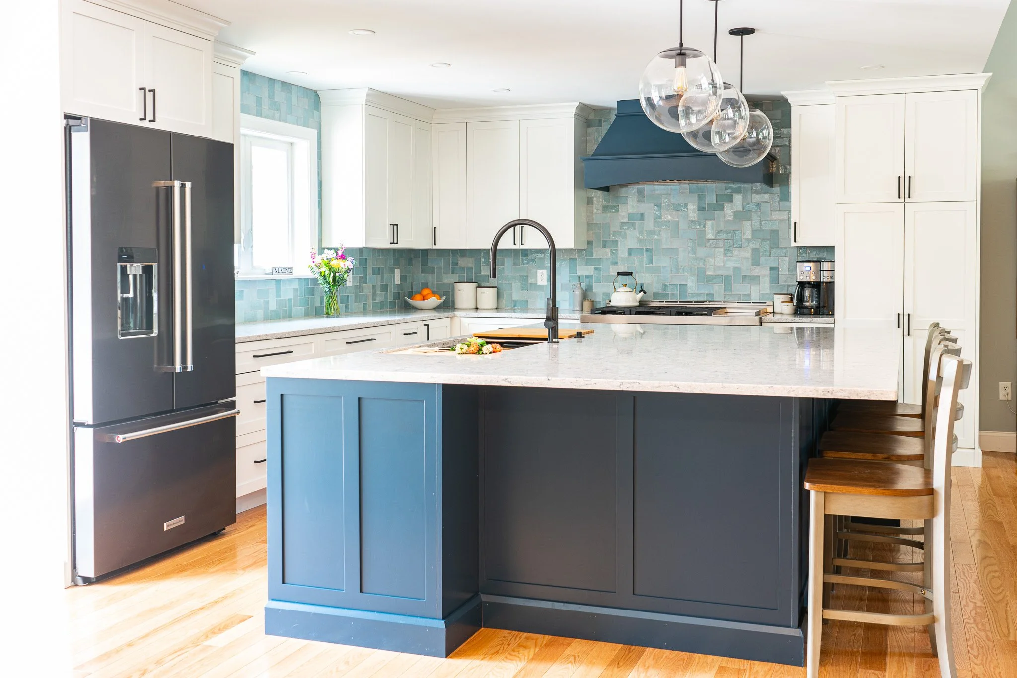 Your kitchen is not complete in 2023 without a textured and modern backsplash. Plus, in our opinion, it is by far the most fun element to design! The number one trend right now is adding a textured glossy pop of color. A natural tone like blue, green, and warm whites are the most popular. We suggest choosing a timeless color to ensure you love your backsplash for the years to come. That is why we often opt for softer colors. Being on the coast of Maine, we have a special place in our hearts for bold pops of blues to really bring that nautical feel to life. In the Saco kitchen remodel featured above, we used a balance of softer blues for added visual interest. Our clients loved the finished product!