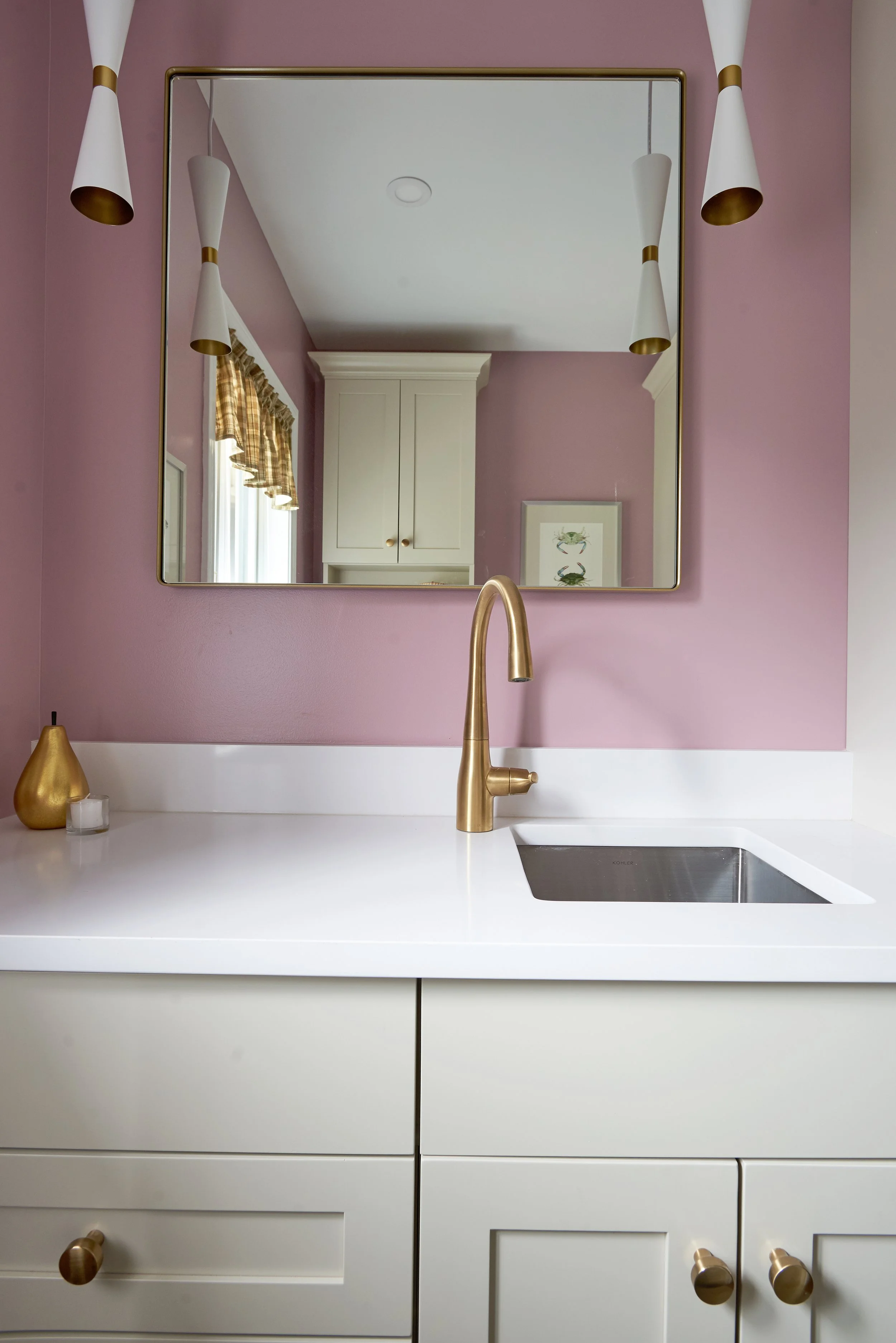 We love when our clients want to go bold! Having a statement wall in a bathroom is a great place to express your personal style without having to apply it to a larger part of the house. The curtains in this bathroom and the gold features of this room give it a more vintage flare, sinking into the mid-century modern look that continues to stay popular and seen in all areas of design today.