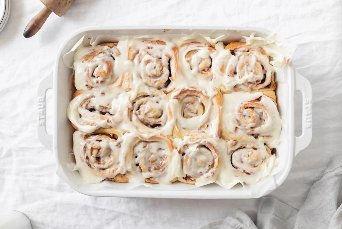 Use floss or a very sharp knife to cut the dough into 12 even rolls. Place the rolls in a 9 x 13 inch pan lined with parchment paper. Cover loosely with a dish cloth and allow to rise for another hour until doubled in size and puffed up.